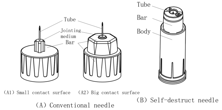 In addition to the length difference of the needle, the structural difference of the needle cannot be ignored. According to the structural design, the needles can be divided into two types:conventional type (Fig.1A) and self-destruct type (Fig.1B). The self-destructing needle has an axially retractable needle seat, which gradually exposes the needle tube after being stressed. The needle seat triggers the mechanical self-locking structure in the shell, so that the needle seat cannot be retracted again after reset. The conventional needle does not contain a mechanical self-locking shell. According to the different sizes of its connecting parts, it can be divided into two types:small contact surface and large contact surface. Among them, in the commercially available large contact surface needles, according to the different shapes of the contact surface, it can be divided into three shapes:regular hexagon, circle and cross.