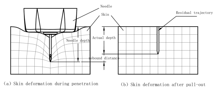 1.4.3 Piercing depth and damage experiment Because the skin has the characteristics of super-elasticity, after applying pressure to the skin surface, it will cause extrusion deformation in the lower part of the skin. The tip displacement is divided into the displacement caused by the skin being squeezed and the relative displacement of the tip in the skin. The actual penetration depth of the needle tip is the trajectory length remaining in the skin after the needle is pulled out and the skin is not stressed, as shown in Fig.2.