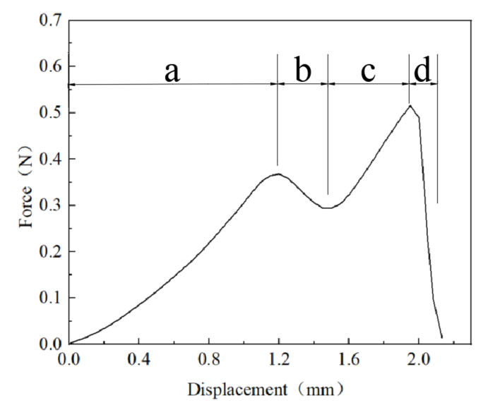Combined with the experimental data obtained, a set of data at 150mm/min of IPN was selected as a typical sample, and the needle insertion process can be divided into four stages, as shown in Fig.3. The first stage:the surface of the polyurethane film is in contact with the tip of the needle, and the tip is deformed under the action of the tip displacement. The tip does not puncture the surface, and the needle resistance gradually increases, which corresponds to the a stage in Fig.3 on the data. The second stage:the local pressure on the surface of the polyurethane film reaches the critical value of its tensile strength, the needle tip punctures the surface, the film stress is released to a certain extent, the needle resistance decreases significantly, and the first peak is formed, which corresponds to the b stage in Fig.3 on the data. The third stage:the contact surface between the tip side wall and the polyurethane film increases, and the tip contacts with the bottom surface of the polyurethane film, but the bottom surface is not pierced, and the needle resistance rises again, which corresponds to the c stage in Fig.3 on the data[20]. The fourth stage:the needle tip pierces the bottom surface, and the polyurethane film is penetrated to form a second peak, which corresponds to the d stage in Fig.3 on the data.