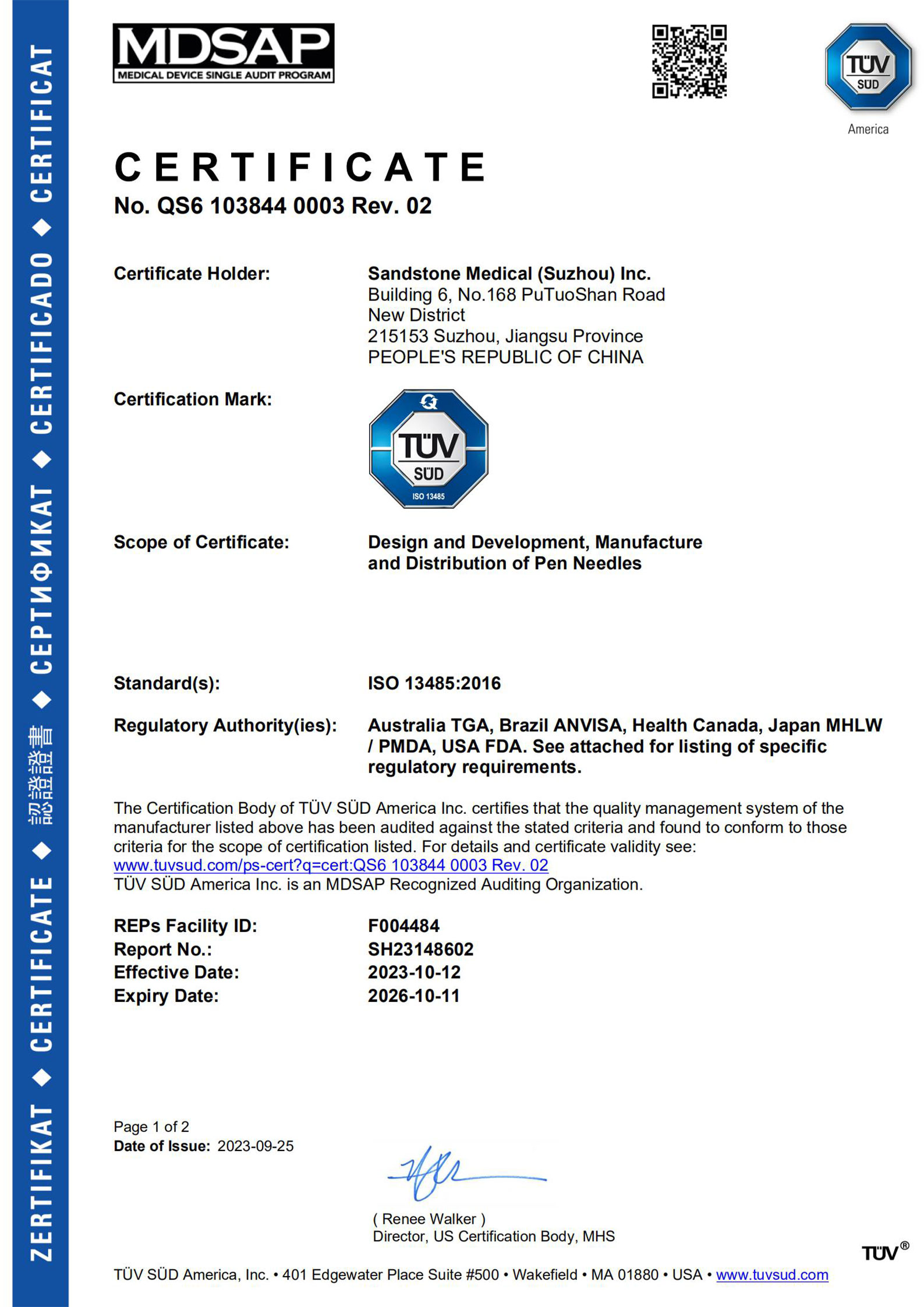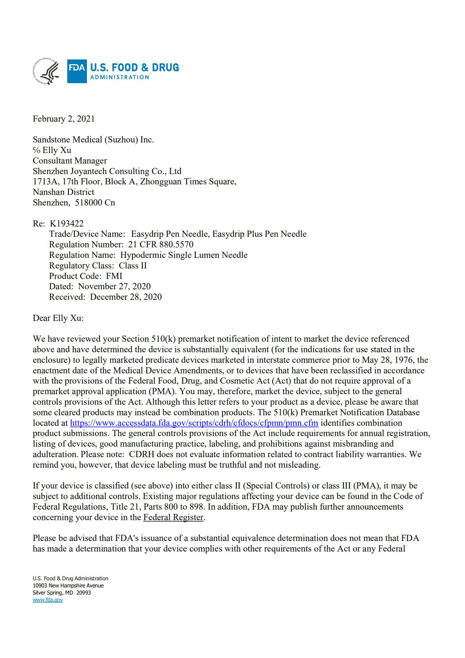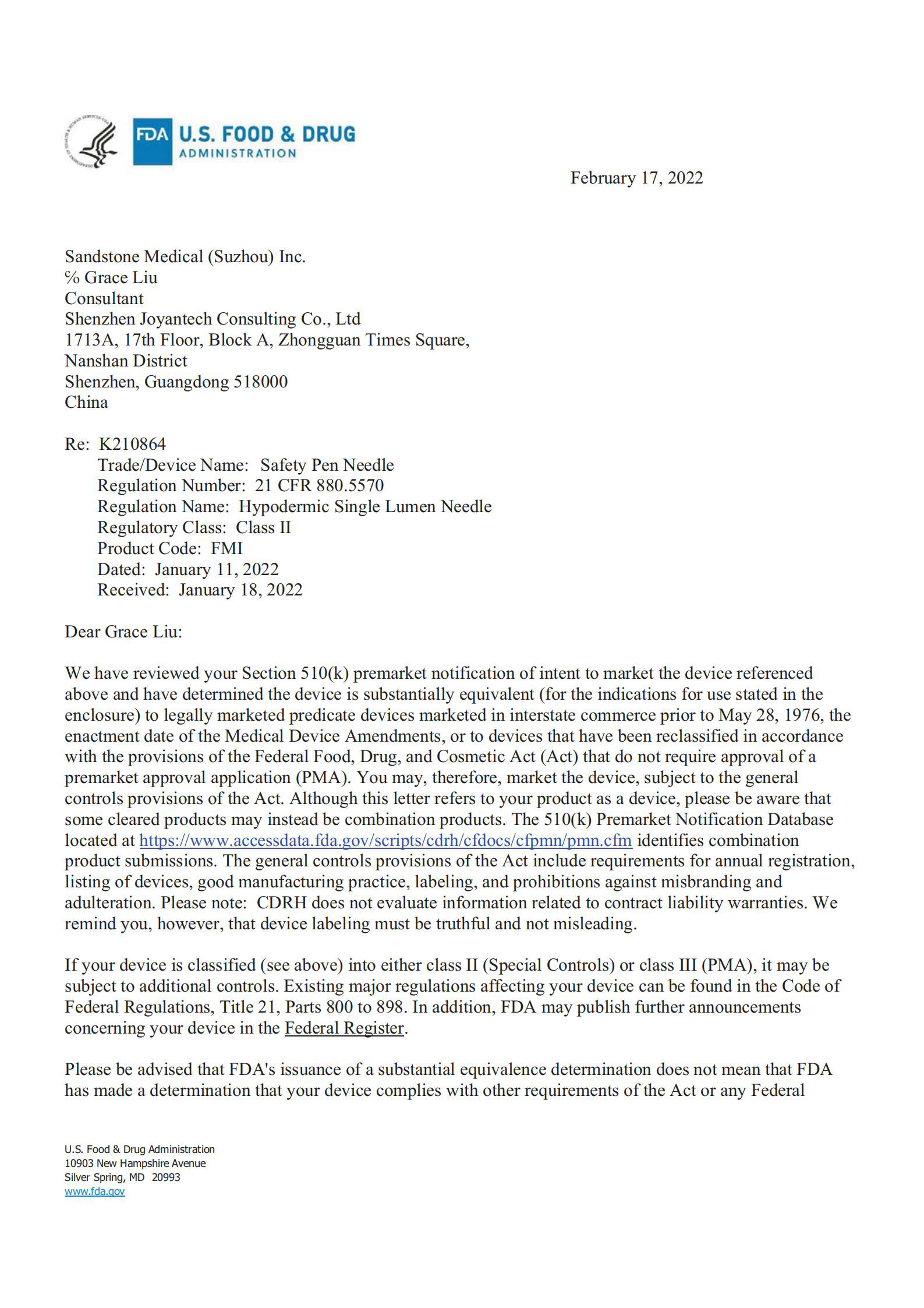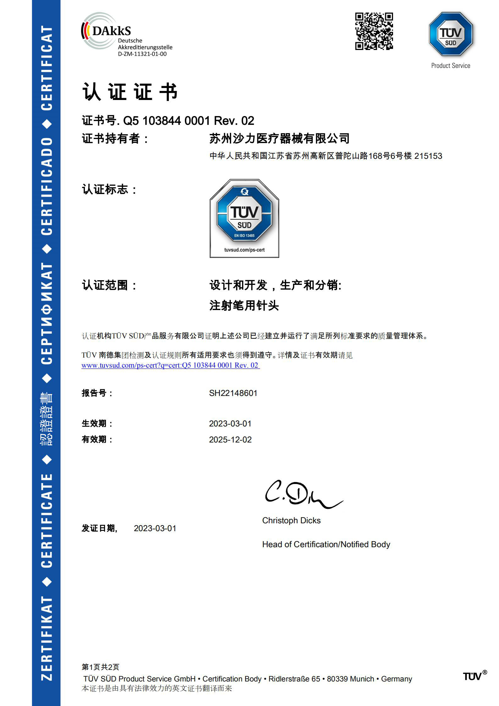 沙力医疗坐落于苏州高新区医疗器械科技产业园,是一家致力于研发、生产和销售药物输注耗材的专业化公司,自2018年成立以来,公司已顺利通过了ISO13485、欧盟 CE认证、美国FDA注册、医疗器械单一审核项目MDSAP认证、巴西ANIVSA、并获得了日本药事医疗器械发令下国外制造商注册登记FMR。